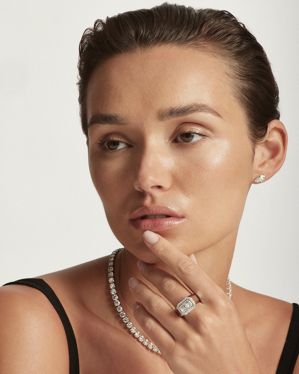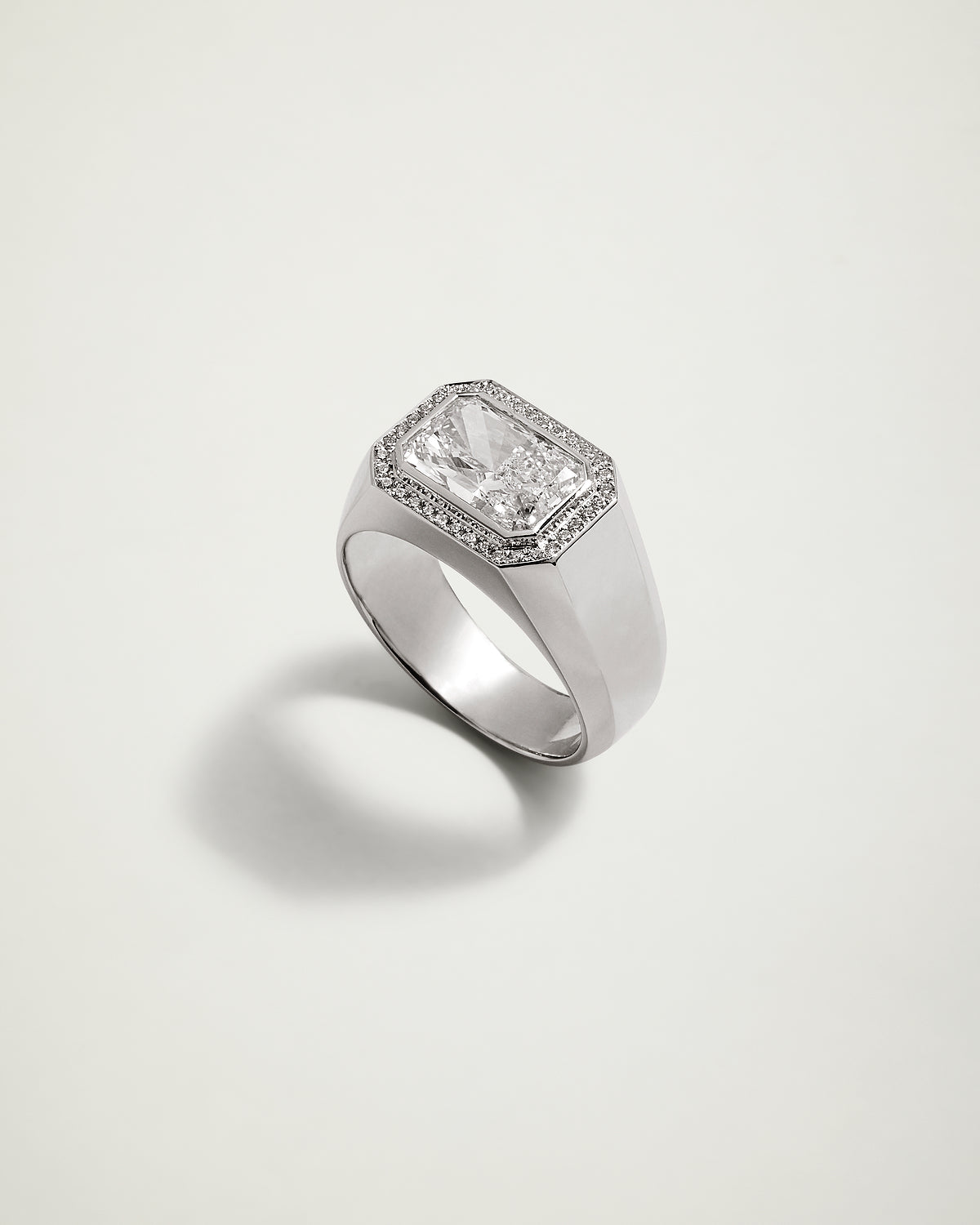 The Platinum diamond signet ring features a bold 3.5ct lGI certified laboratory grown radiant cut diamond at its heart. The central diamond is surrounded by 36 round diamonds.