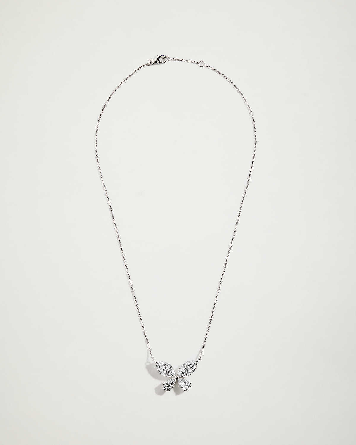 The Butterfly Diamond Necklace features two 1 carat marquise cut diamonds and two 1.5 carat pear cut IGI-certified laboratory-grown white diamonds. Elegantly claw-set and suspended on an 18K white gold chain, total carat weight of 7.17 carats.