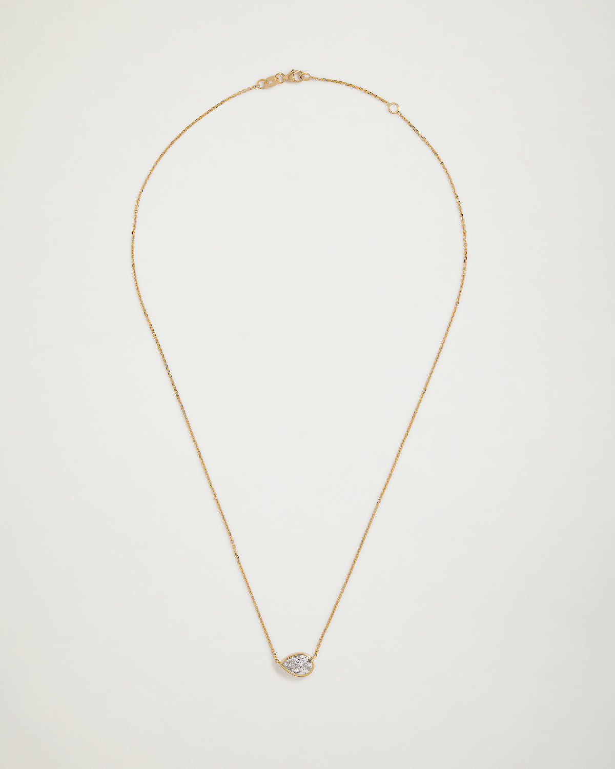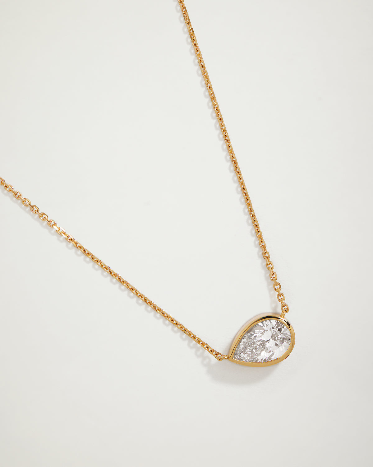 A stunning 1.50 carat IGI certified laboratory grown pear diamond, securely bezel-set for everyday elegance, suspended on our signature 18-karat yellow gold chain.