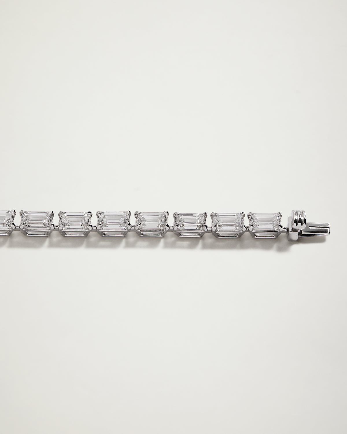 Meticulously crafted in 18K white gold, featuring 21 laboratory grown emerald cut diamonds. With a total weight of 14.02 carats.