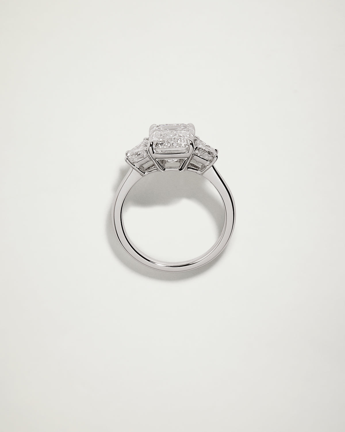 The Emerald Cut White Diamond Trilogy Engagement Ring features a stunning 4.09ct Emerald-cut laboratory grown diamond as its centrepiece set in lustrous 18k white gold, complemented by two perfectly proportioned trapezoid shoulder stones, totalling 1.07ct, creating a harmonious balance of brilliance and sophistication.