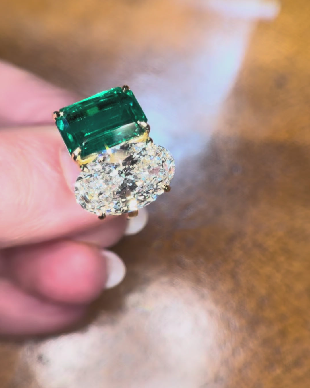 Bespoke Heidi & Hart, crafted with an irresistible natural 4ct emerald and a 6ct VVS2 oval diamond, set in 18ct yellow gold with an oval diamond halo.