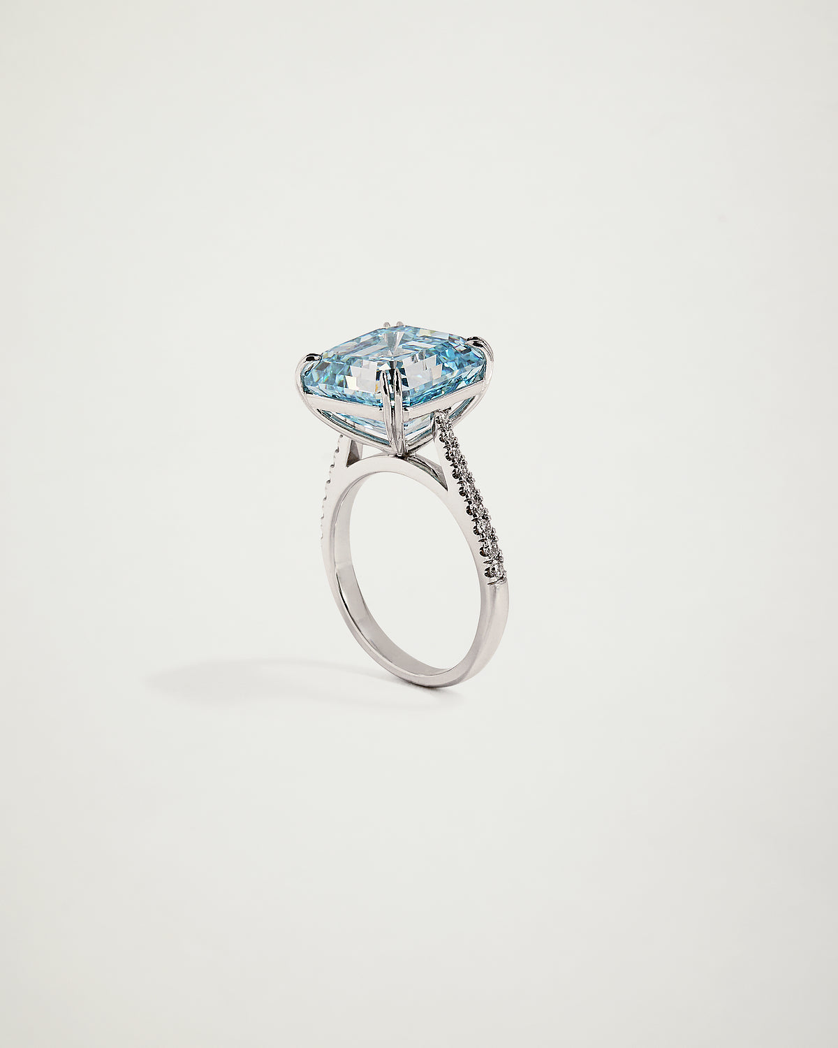 The Blue Asscher Ring, meticulously handcrafted in-house by Benjamin Hart, Master Craftsman and Founder, is a testament to exceptional artistry and innovation.