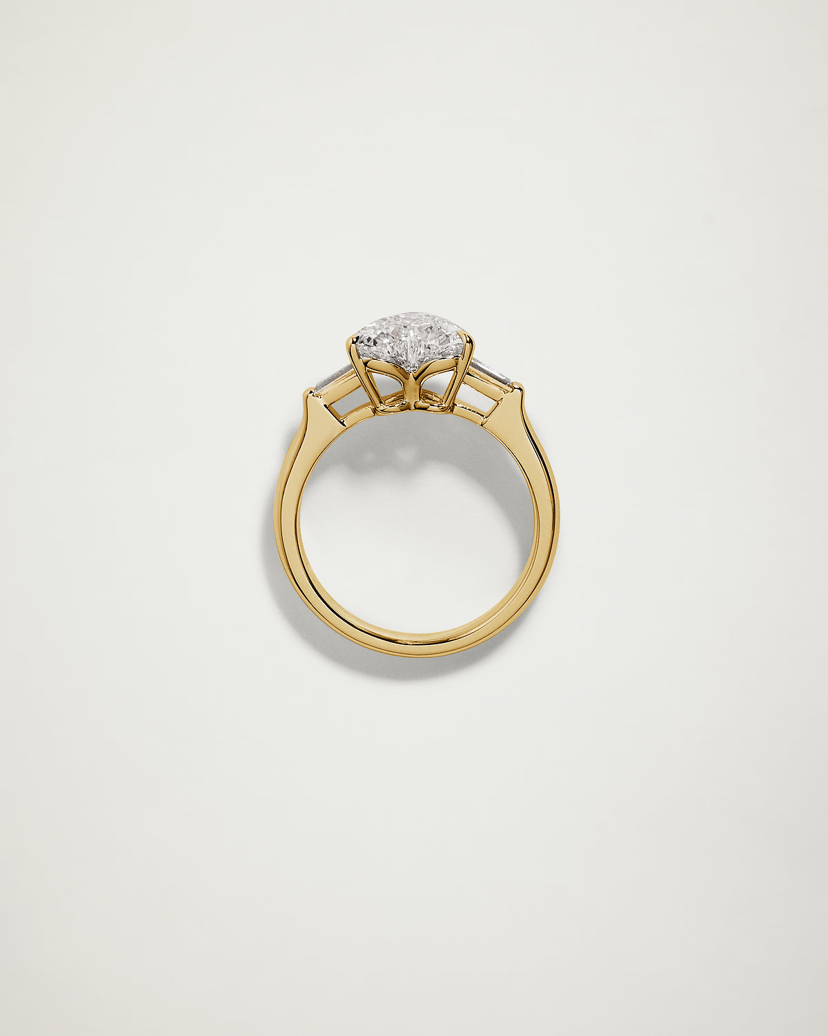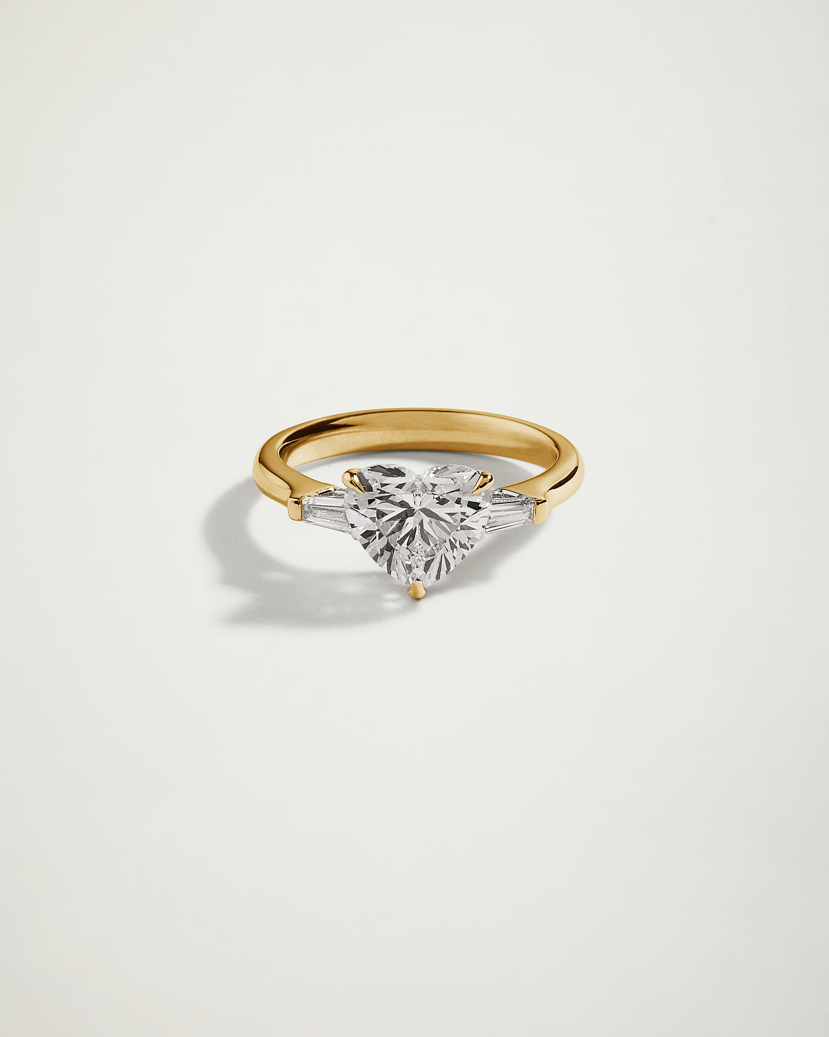 The Heart Diamond Engagement Ring with Baguette Diamond Shoulder Stones is a timeless engagement ring design. Set in luxurious 18k yellow gold, this engagement ring features a beautifully cut diamond heart, flanked by subtle, tapered diamond baguettes.