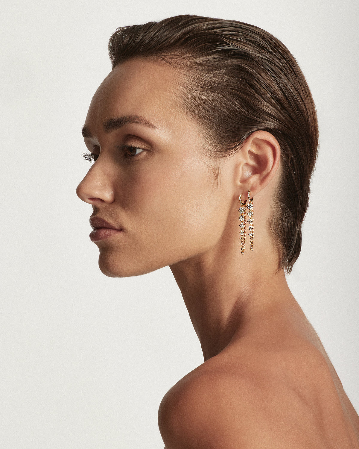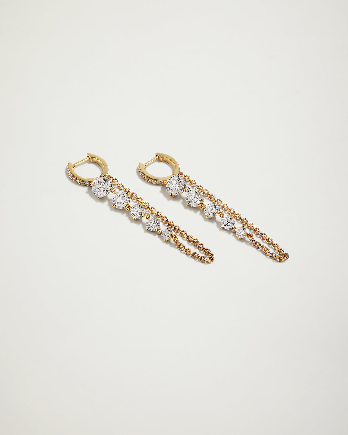 These chain earrings, set in 18K yellow gold, adorned with eight pavé-set diamonds on the huggie-style hoops, feature a cascading design of five natural round brilliant-cut diamonds with a combined weight of 3.01 carats. The diamonds taper in size, transitioning from a prominent 0.50ct to a delicate 0.10ct.
