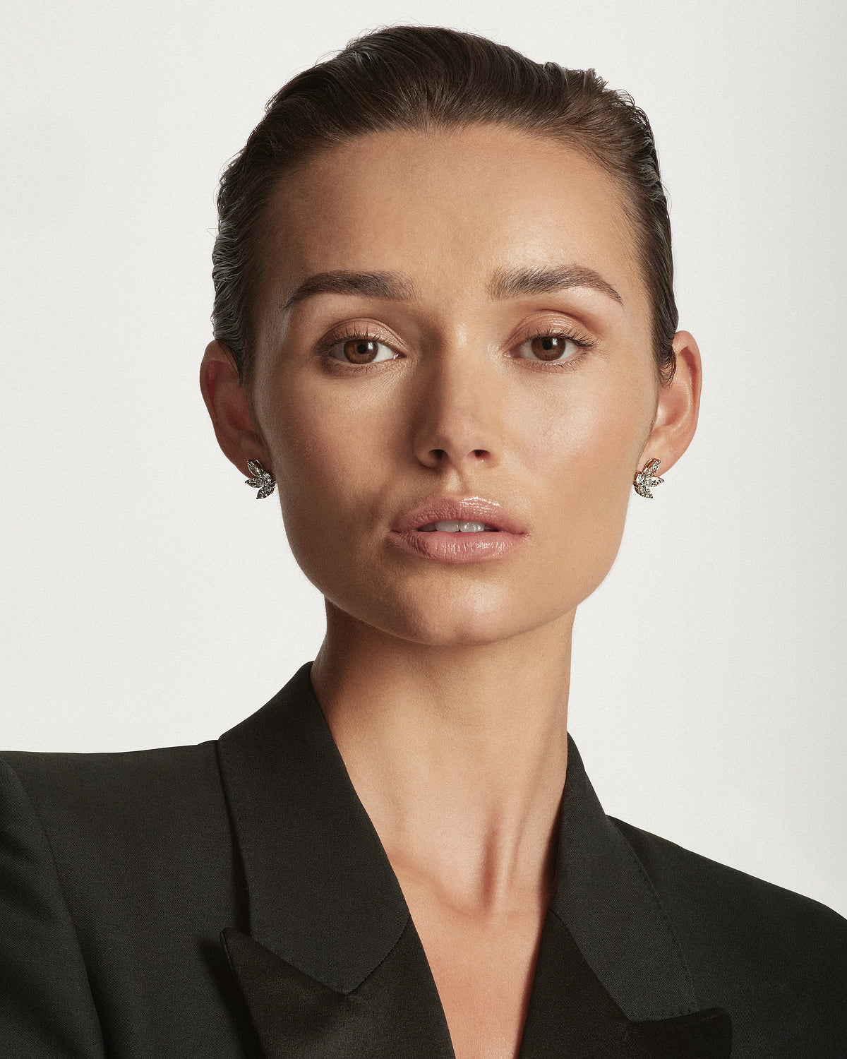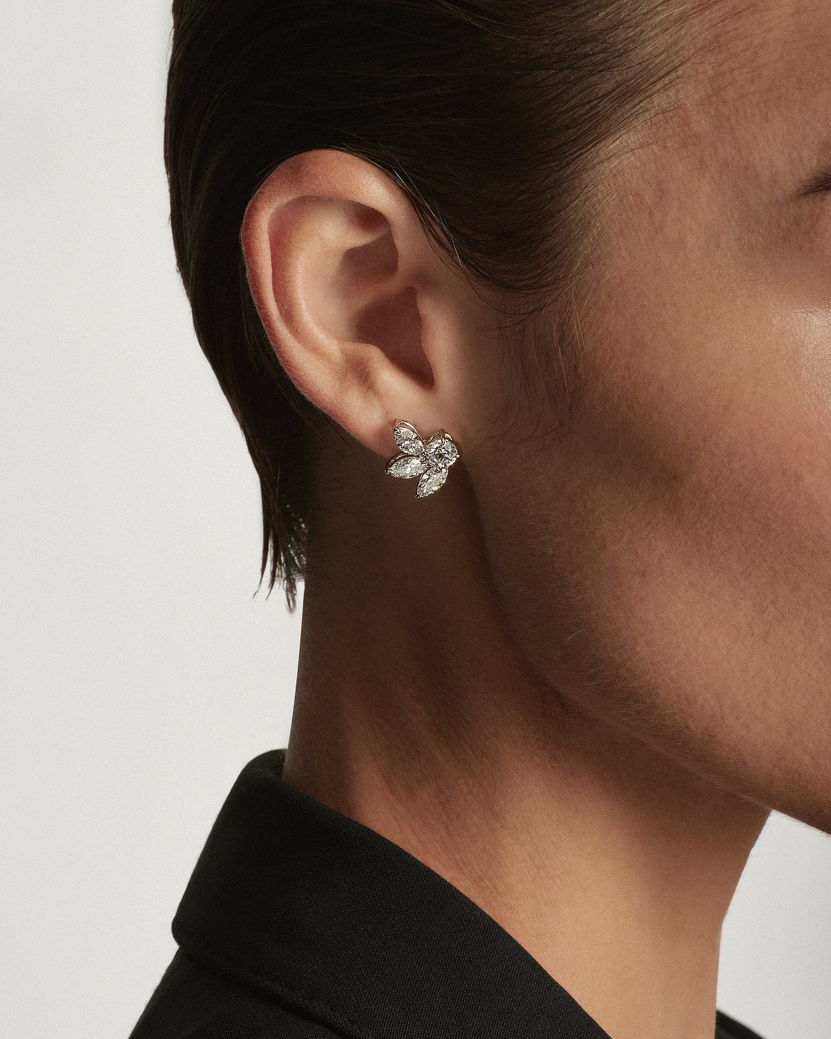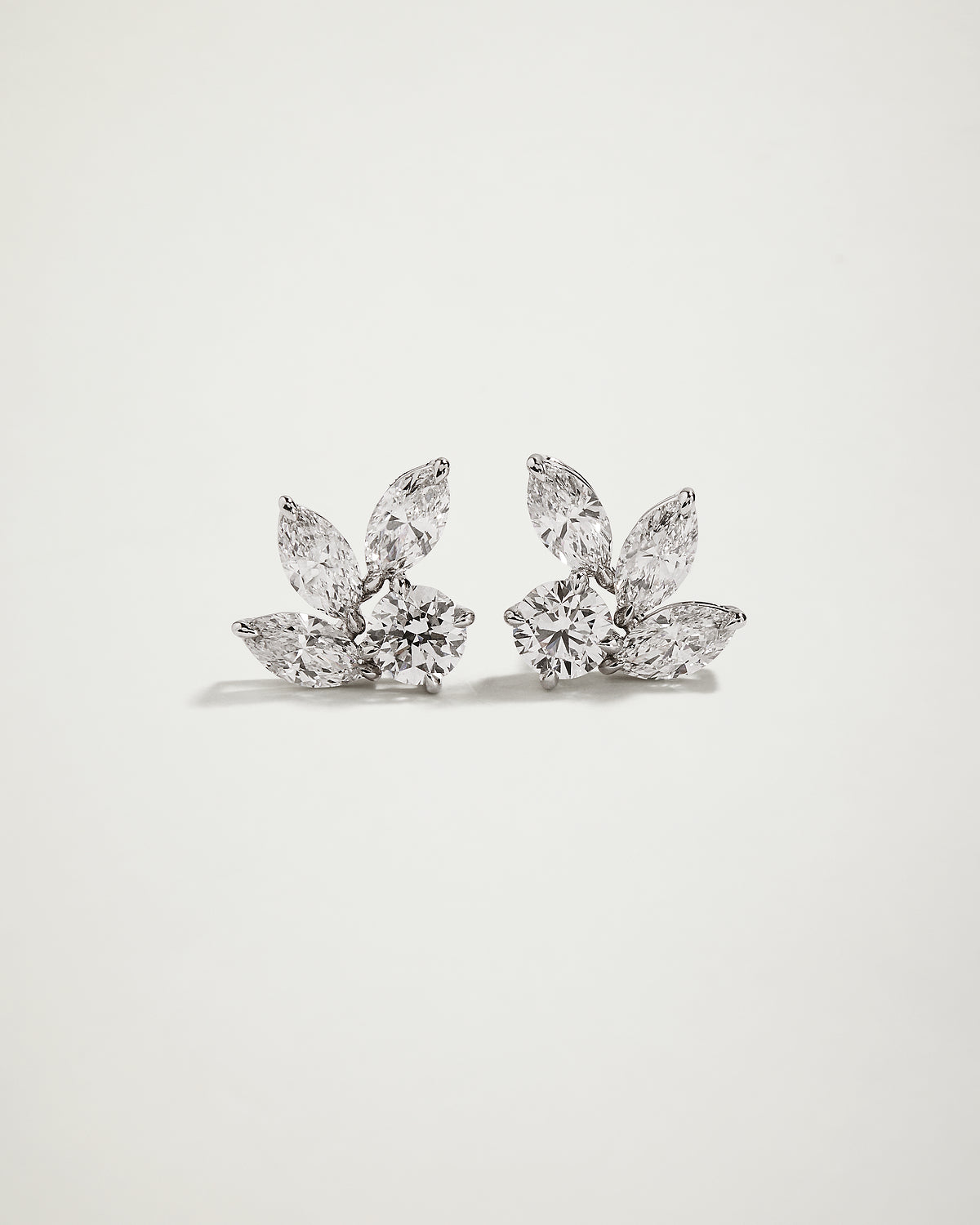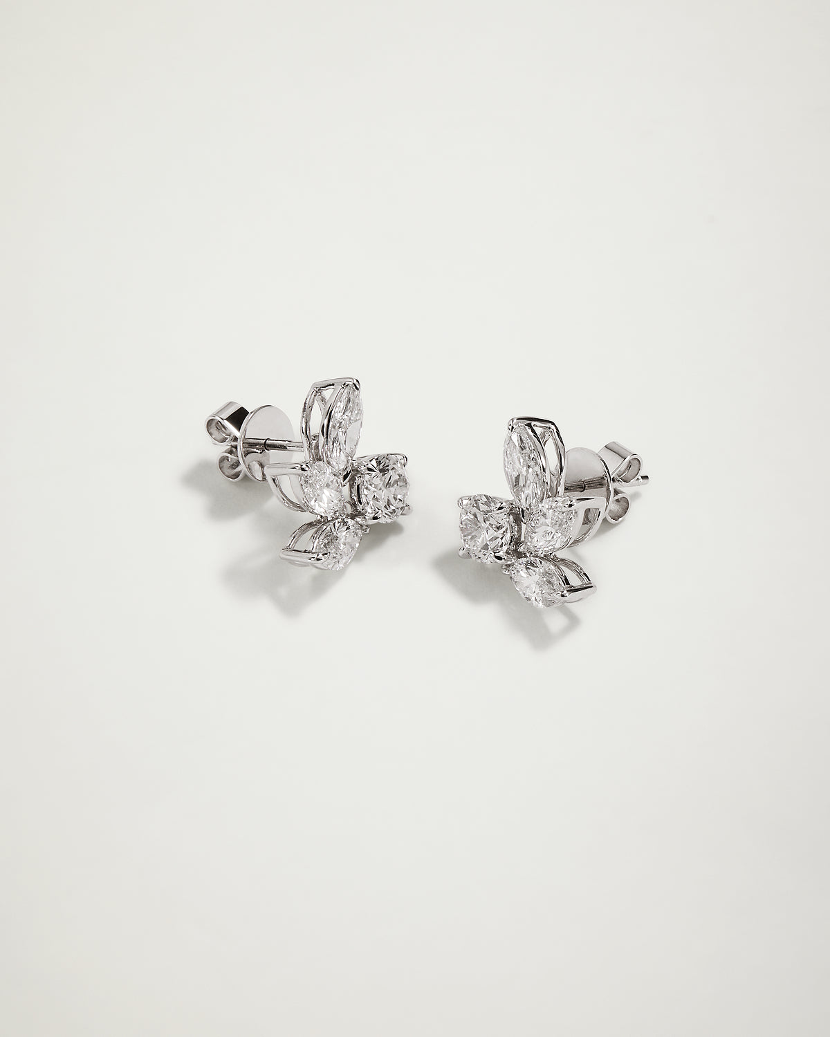 The Heidi Diamond Mini Cluster Studs crafted in 18k white gold, showcases a luxurious arrangement of marquise and round brilliant cut diamonds . With a total carat weight of 4.14 carats, these earrings radiate timeless luxury and sophistication.