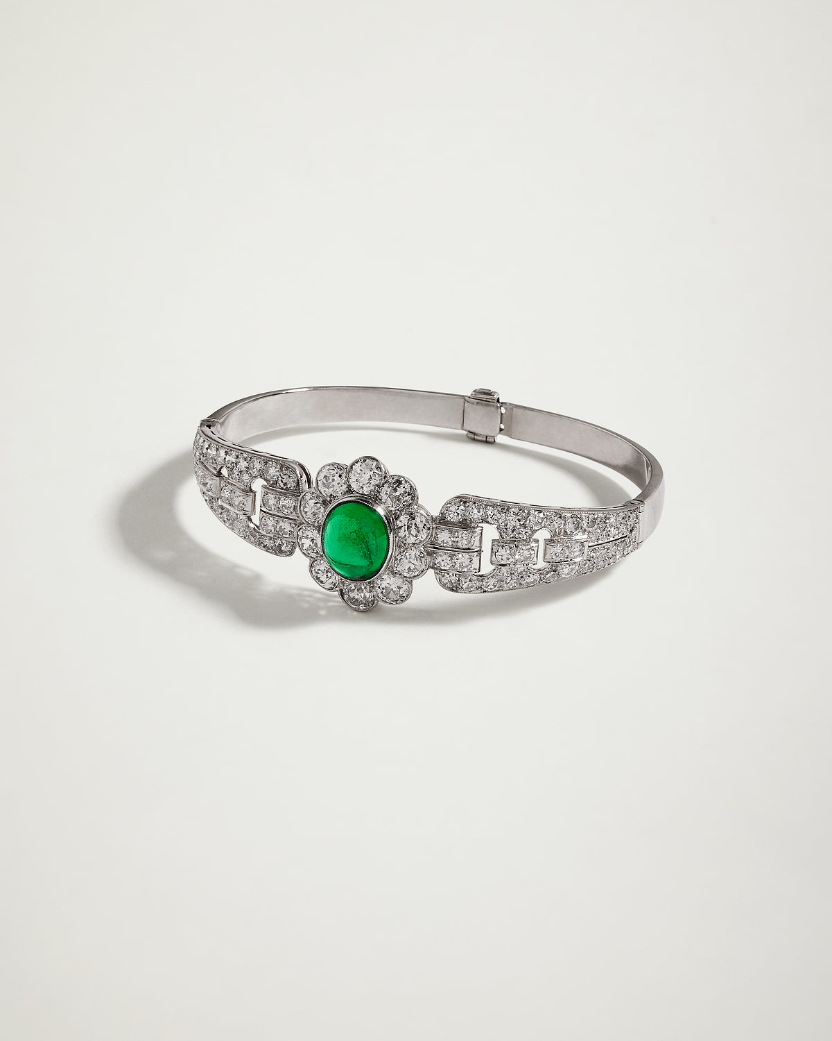 The Heidi's Heritage Emerald Vintage Cuff, set in 18K white gold, featuring a 5.36ct natural cabochon Emerald, bezel-set and encircled by a halo of Old European and early brilliant-cut diamonds.