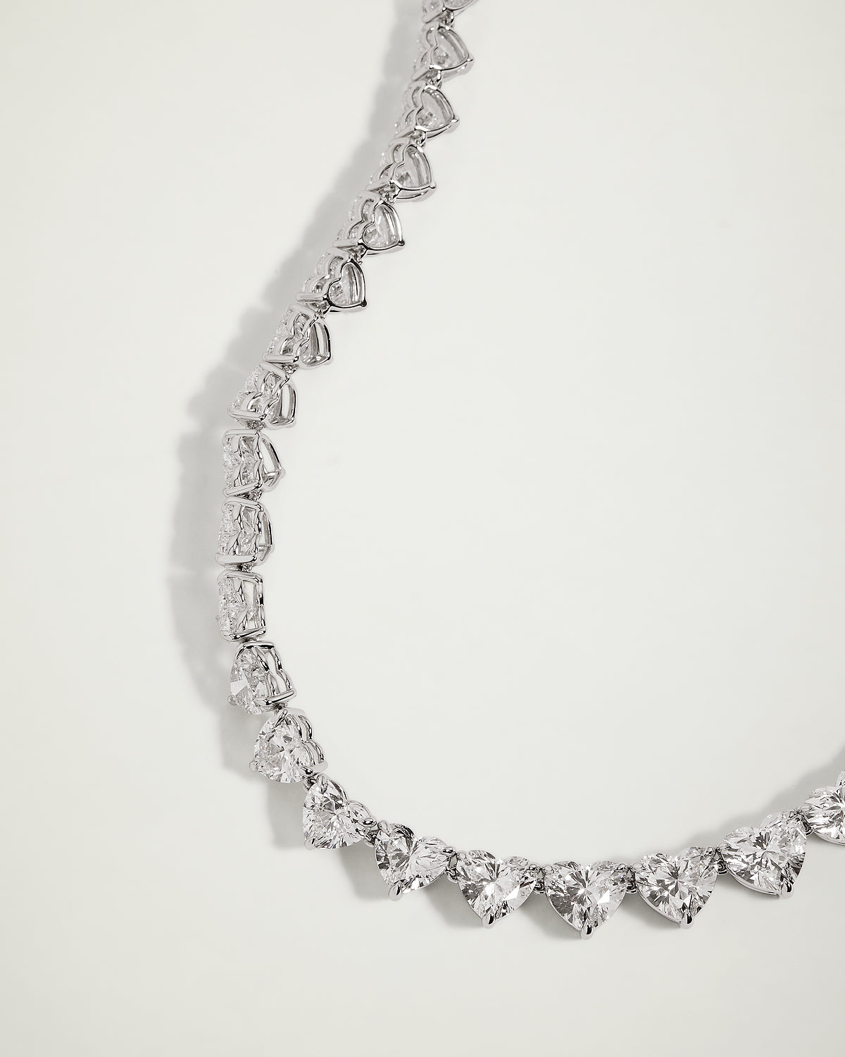 Features 46 heart cut laboratory-grown diamonds, set in 18K white gold, 17 inch length.