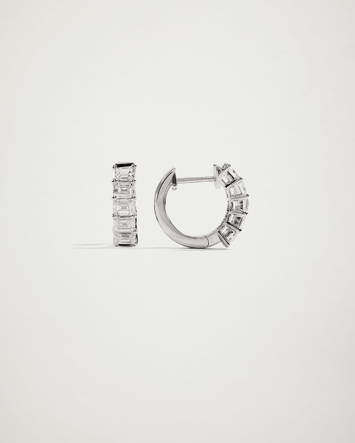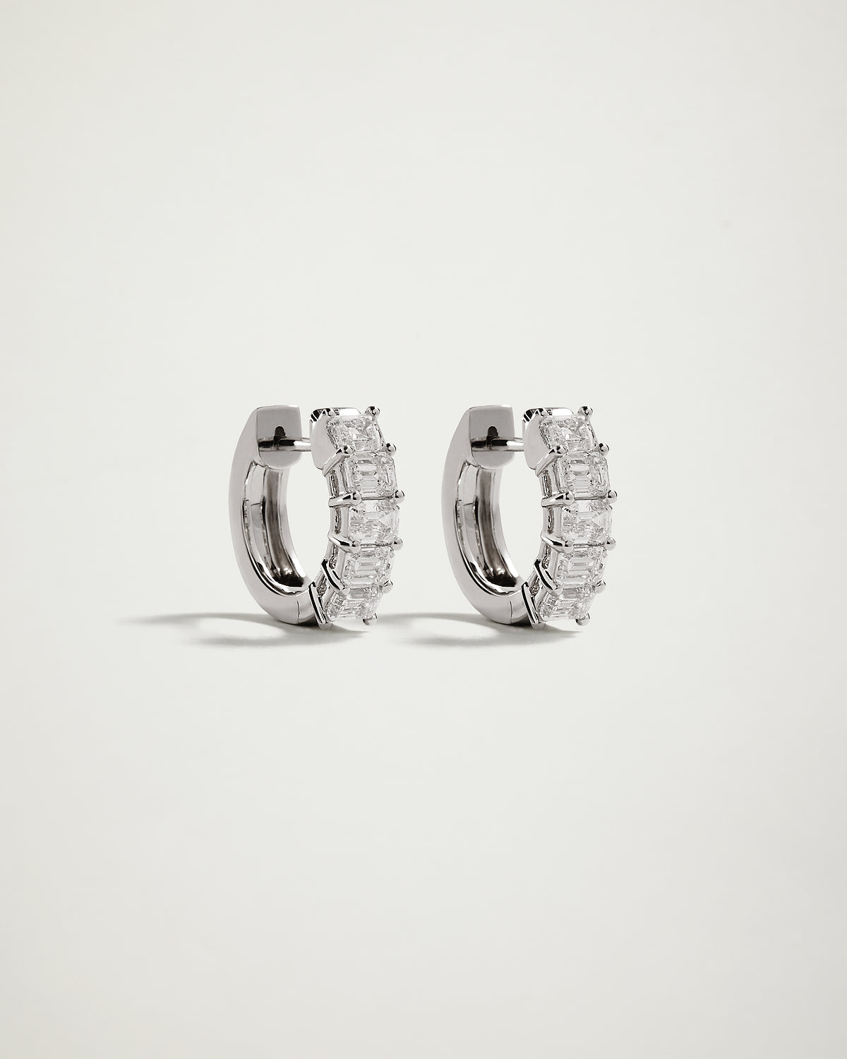 Elevate your ear curation with the this pair of Emerald Cut Diamond Huggie Earrings, each featuring 5 emerald-cut natural white diamonds, totaling 1.38 carats. Set in 18K white gold, these hoops are a luxurious addition to your earring collection.