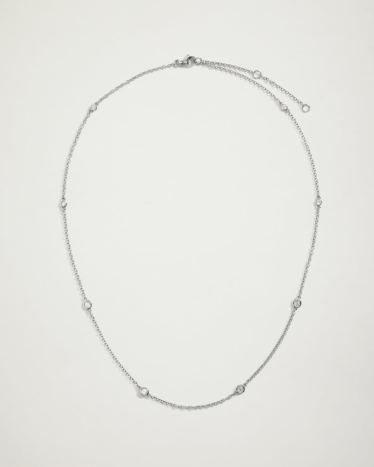 The Round Bezel Set Diamond Necklace, expertly crafted in 18K white gold, showcases eight petite white natural diamonds, each set in a timeless bezel setting.