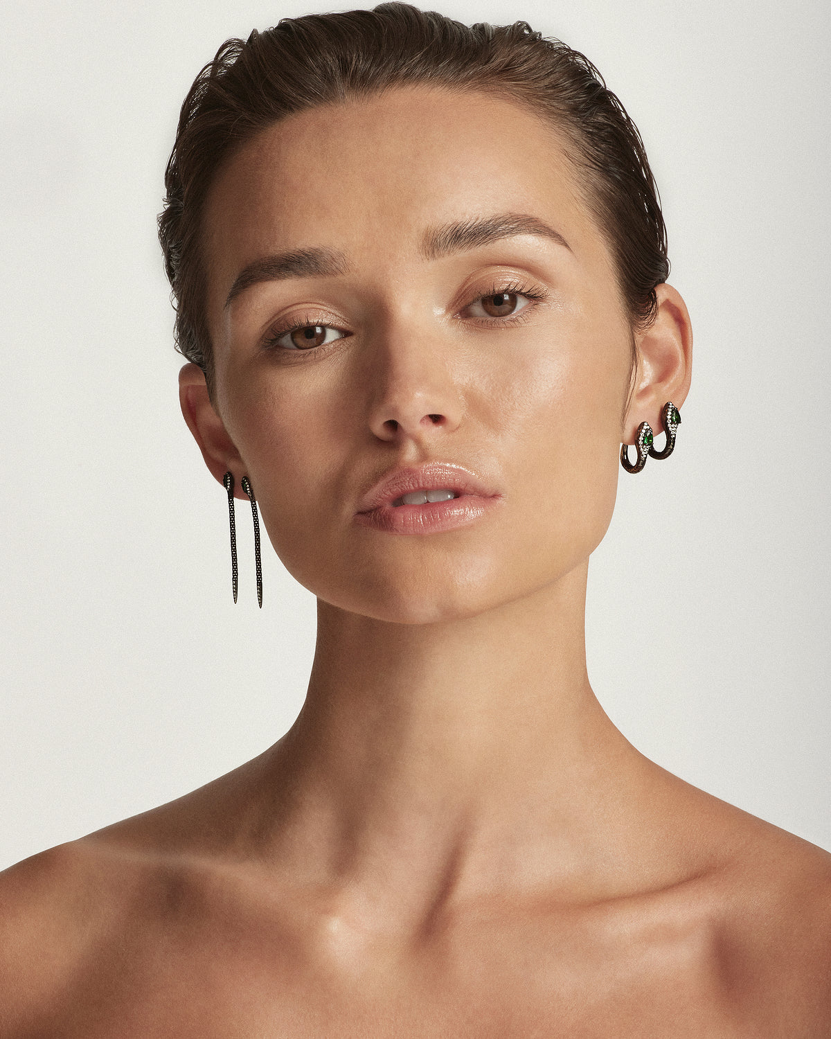 Elevate your ear curation with a pair of Snake Emerald and Diamond Petite Hoop Earrings, a striking embodiment of power and elegance.