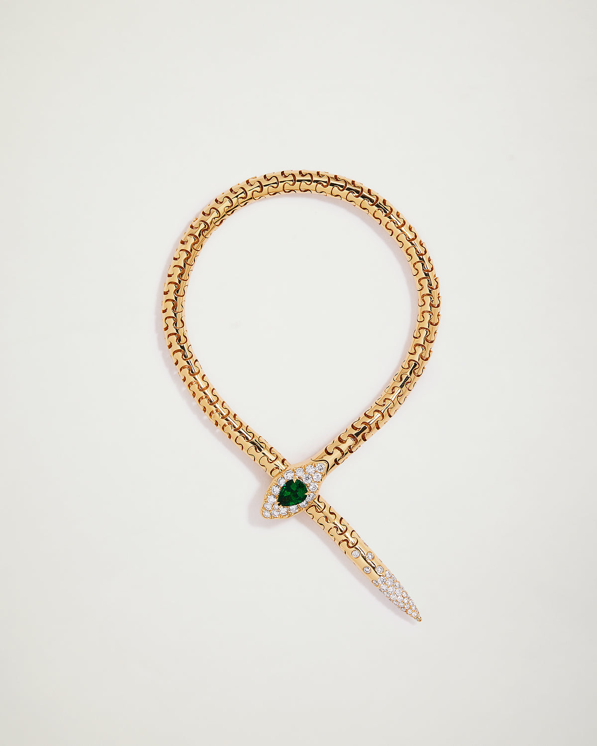 The Snake Emerald & Diamond Bracelet weaves together symbolism and craftsmanship, featuring a natural pear-cut emerald and shimmering white diamonds in 18K yellow gold. A piece of effortless elegance, designed to be worn and revered.