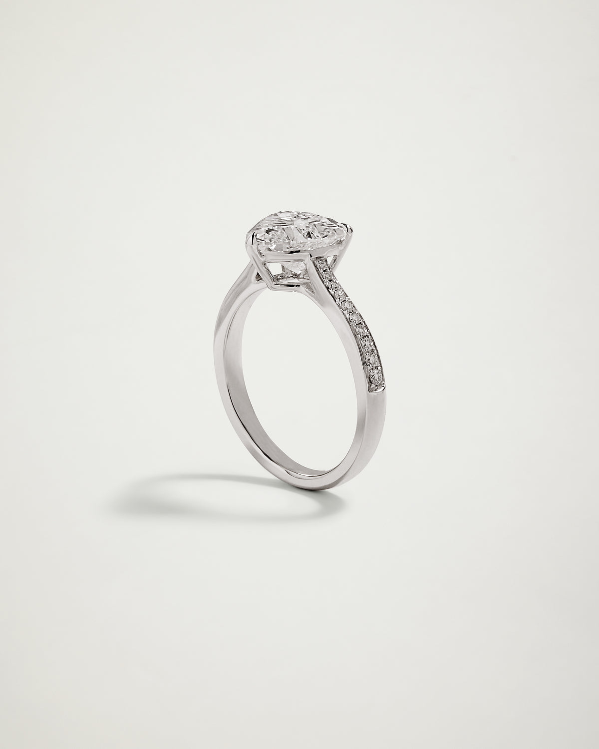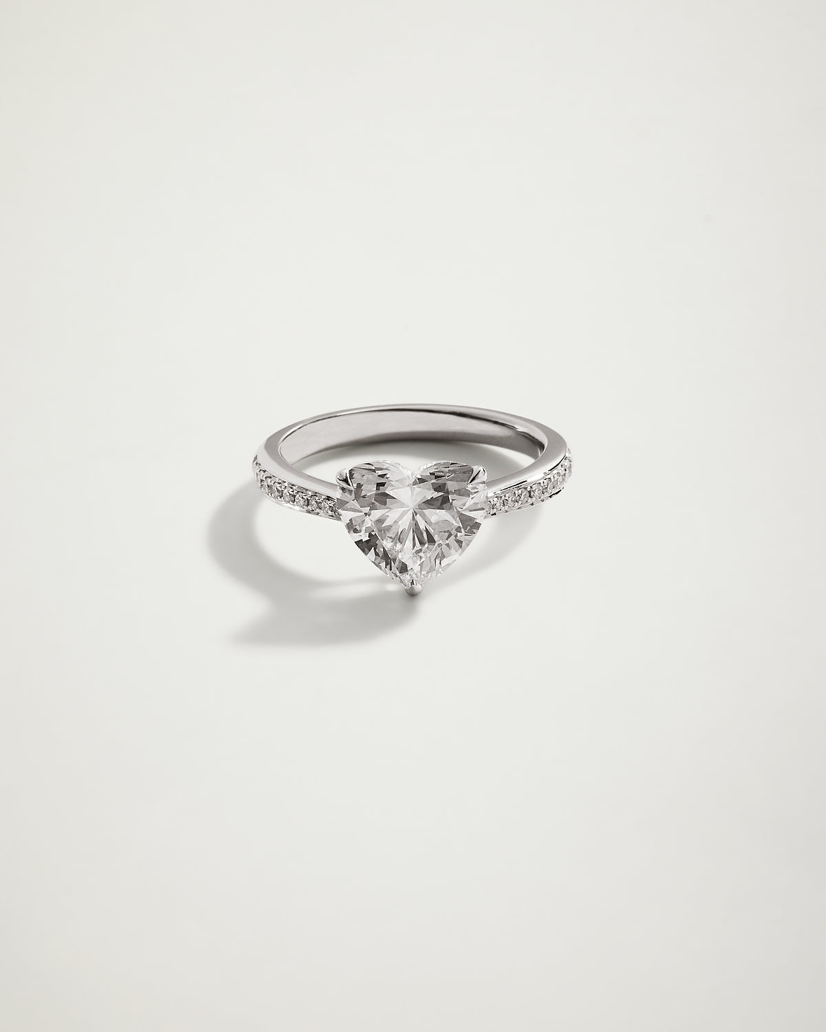 The Solitaire Heart Diamond Engagement ring symbolises true love. This diamond engagement ring showcases a 2.49ct laboratory-grown heart-shaped feature diamond, set into an 18k White Gold band, half encrusted with round white diamonds.