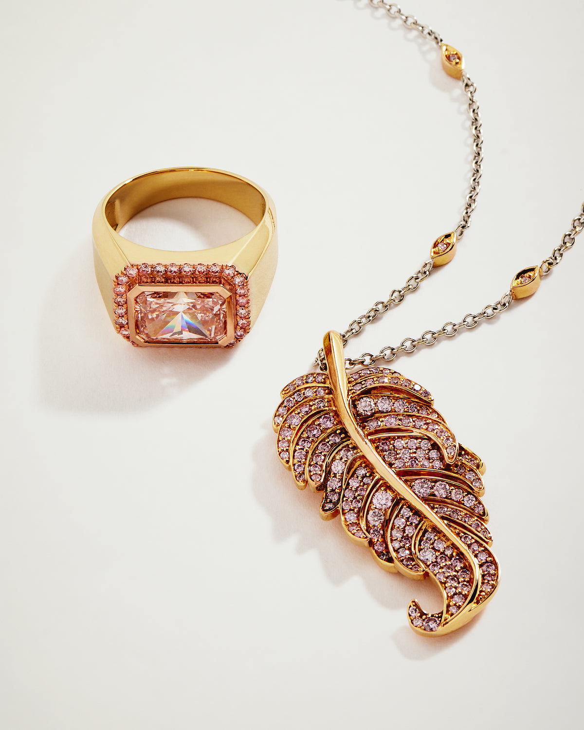 The yellow gold diamond signet ring with Rose Gold Mount features a bold 3.58ct lGI certified laboratory grown radiant cut diamond at its heart. The central diamond is surrounded by 28 round fancy vivid pink diamonds.