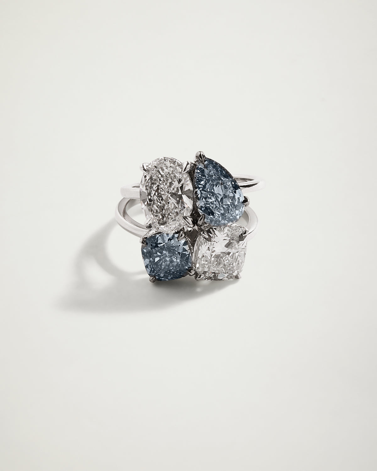 Feature Stones: One Oval Fancy Blue Diamond (2ct) and One Pear-Shaped White Diamond (2ct, D/E, VVS)