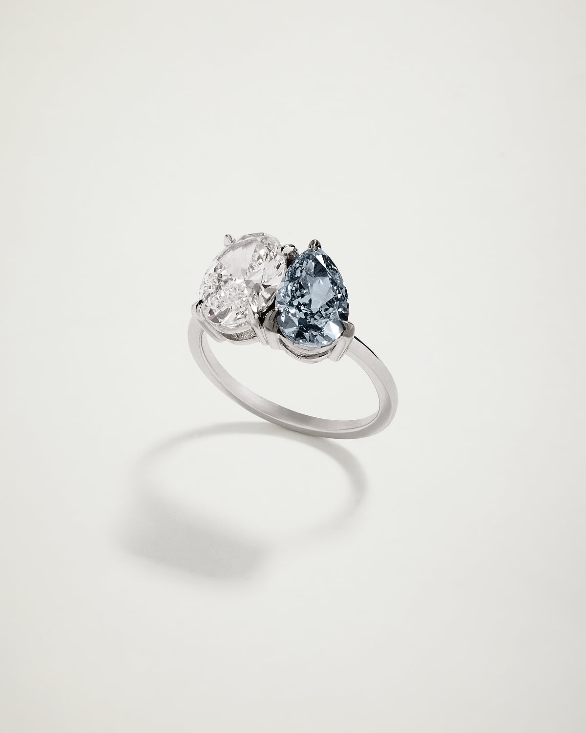 The Toi et Moi Blue & White Diamond Oval & Pear Engagement Ring, represents the union of two souls. Crafted in 18k white gold, this captivating design showcases two exquisite diamonds, a 2ct laboratory-grown fancy blue oval diamond and a 2ct pear laboratory-grown white diamond.