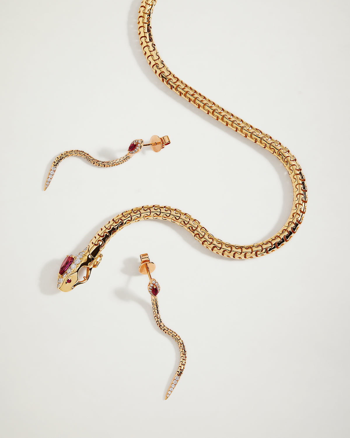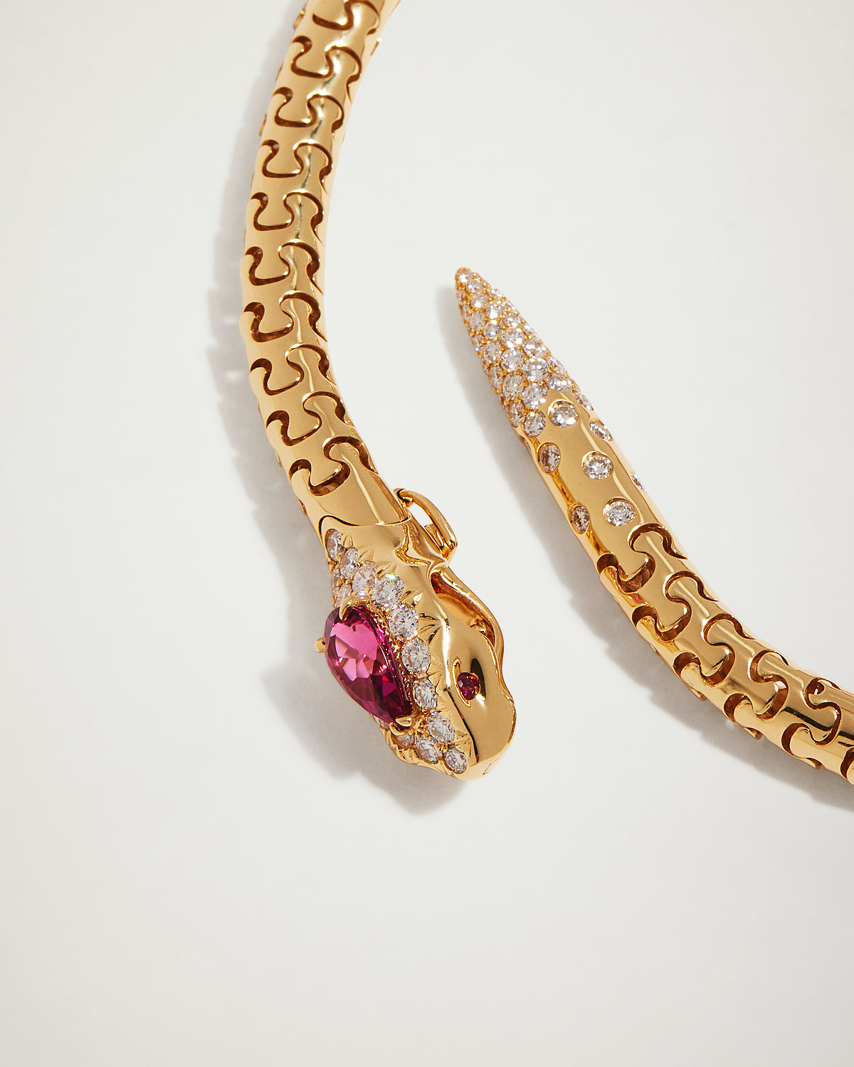 The Snake Pink Tourmaline & Diamond Petite Bracelet features one natural, pear shaped pink tourmaline at the snake's head, accented by round white diamonds, and two round rubies accentuating the eyes, crafted in 18K yellow gold.